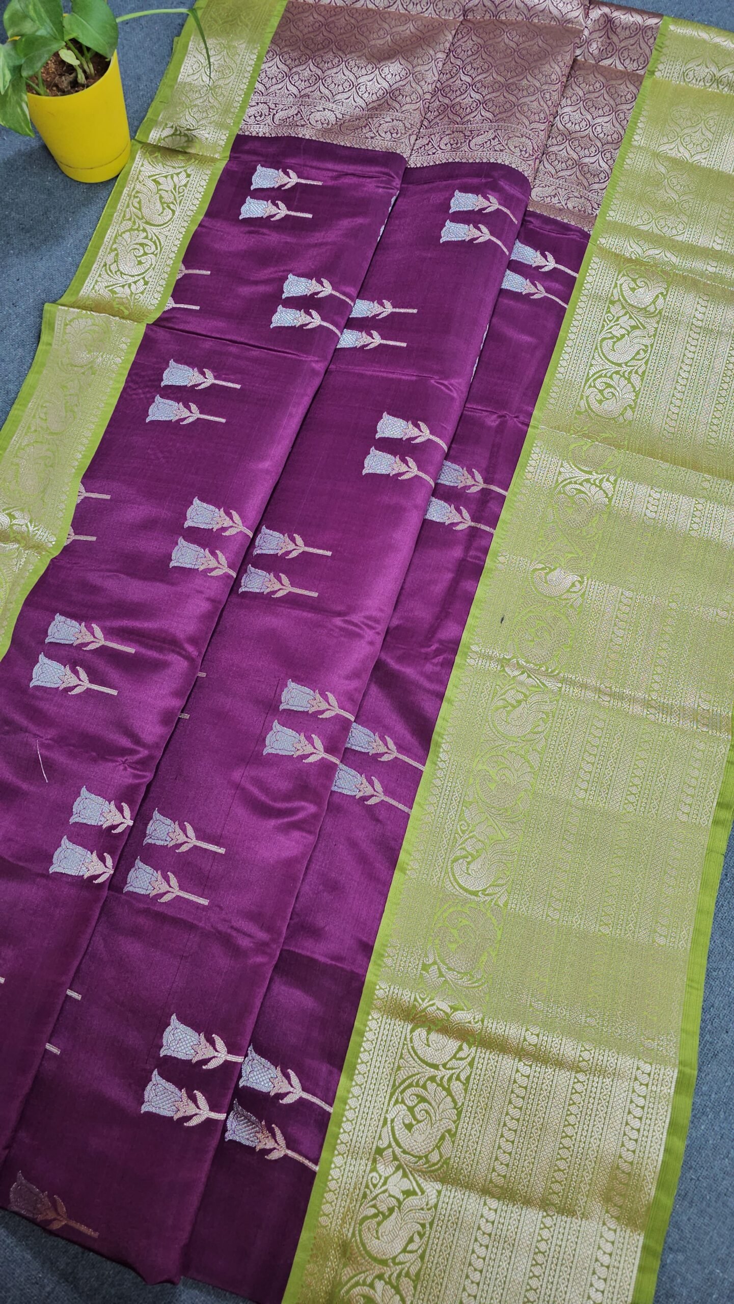 - Pallu: Grand brocade zari pallu
