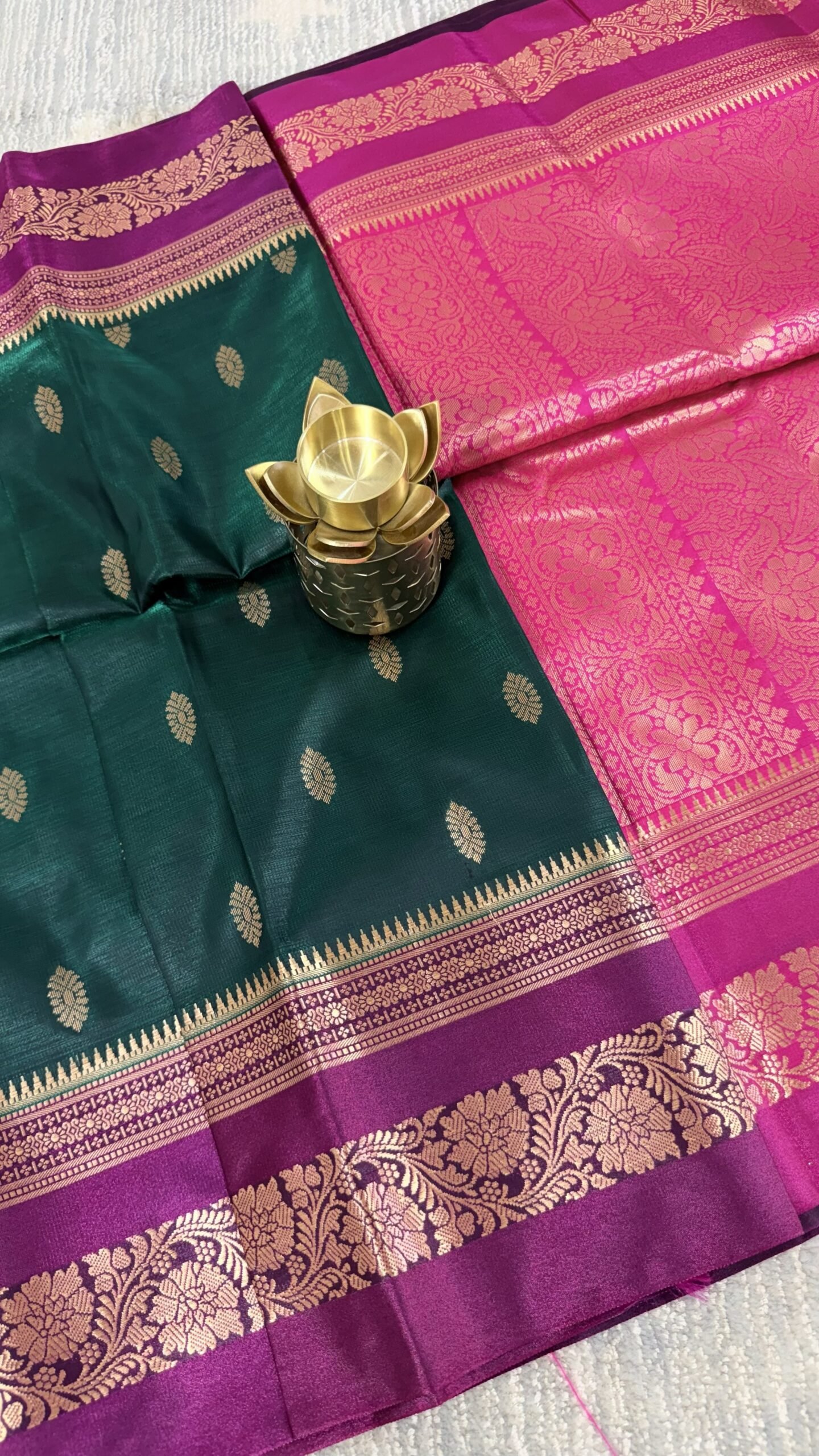 Bottle Green Soft Silk Semi Pattu Saree with zari butties, rich pink border and grand pallu. Perfect festive wear.