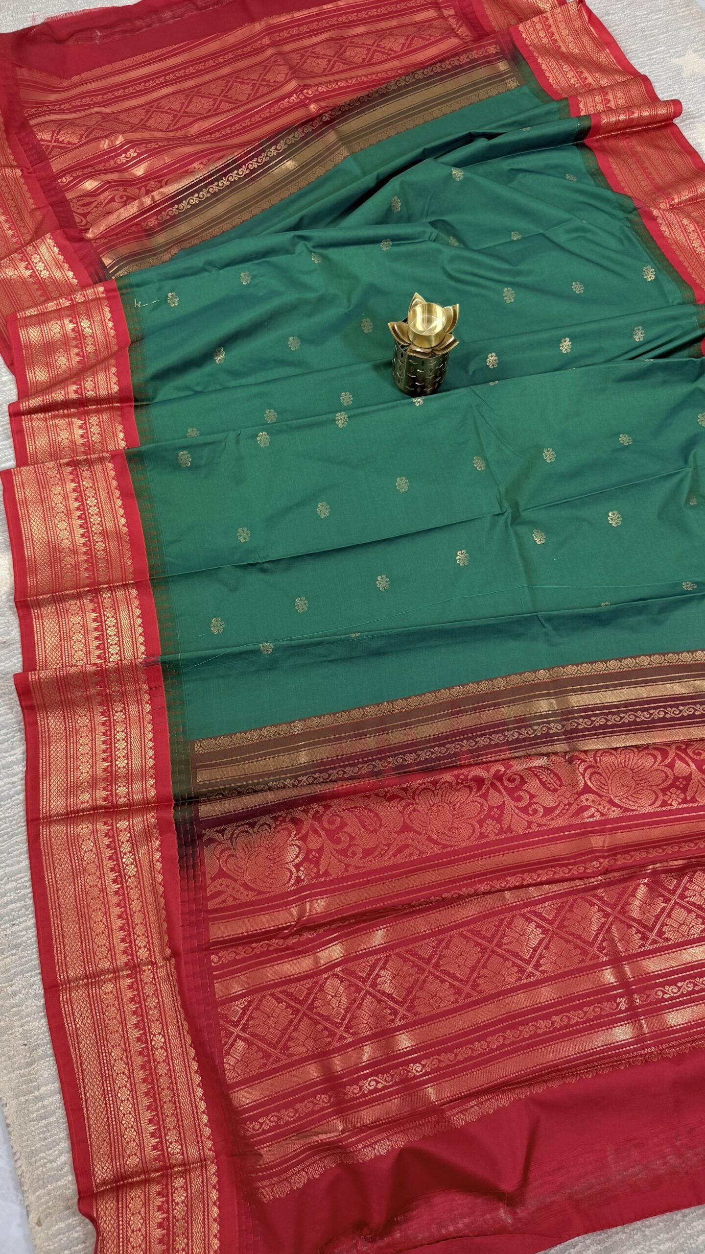 Semi Gadwal Pattu Dupatta featuring a rich green body with elegant zari butties, complemented by traditional Kanchi zari borders and a grand weaving pallu on both sides. This dupatta gives a luxurious ethnic appeal, perfect for festive and traditional wear.