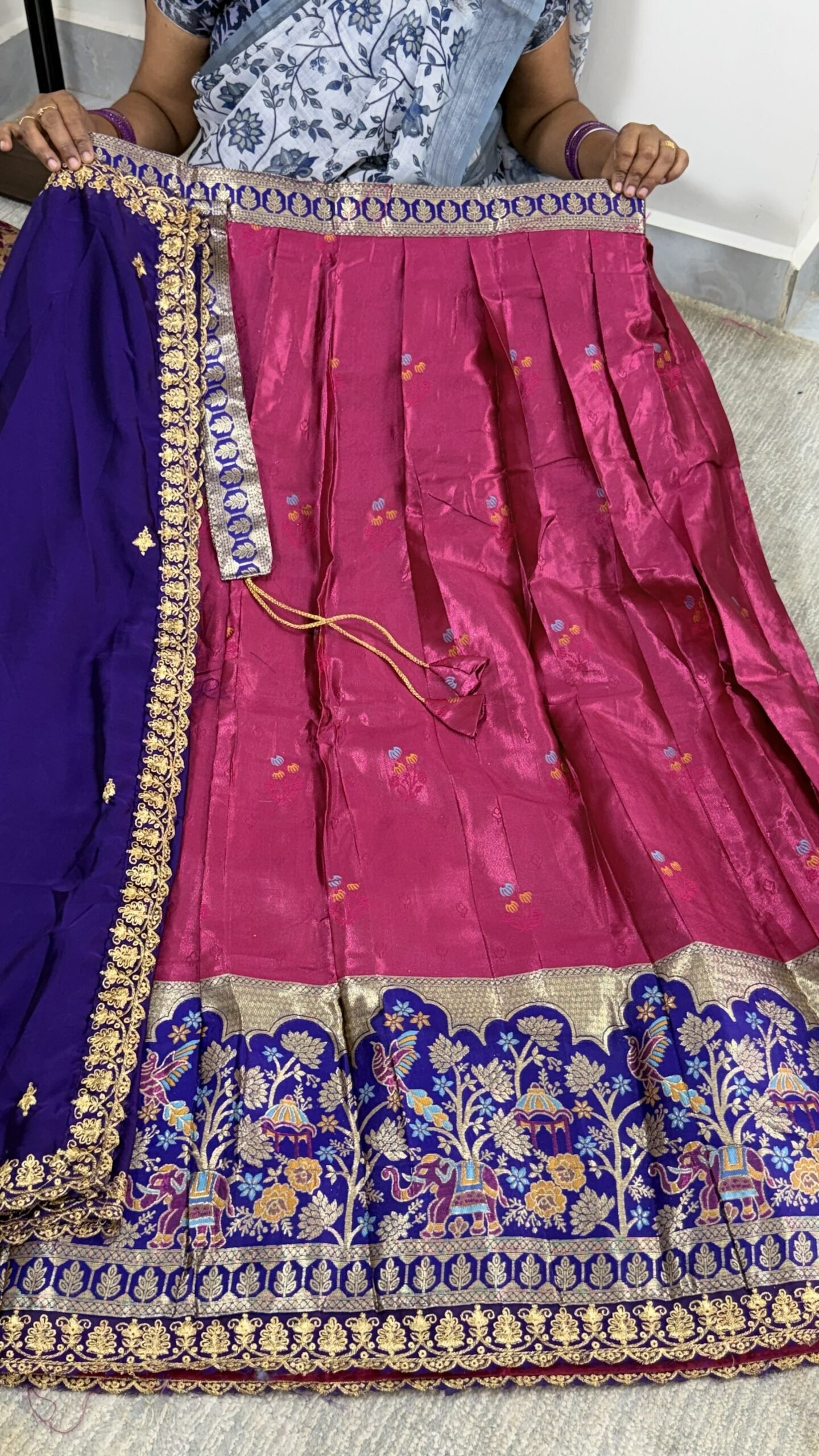 Pink & royal blue half saree set in Kanchi tissue with Meena weaving and elephant-peacock border. Perfect for weddings & festive wear.