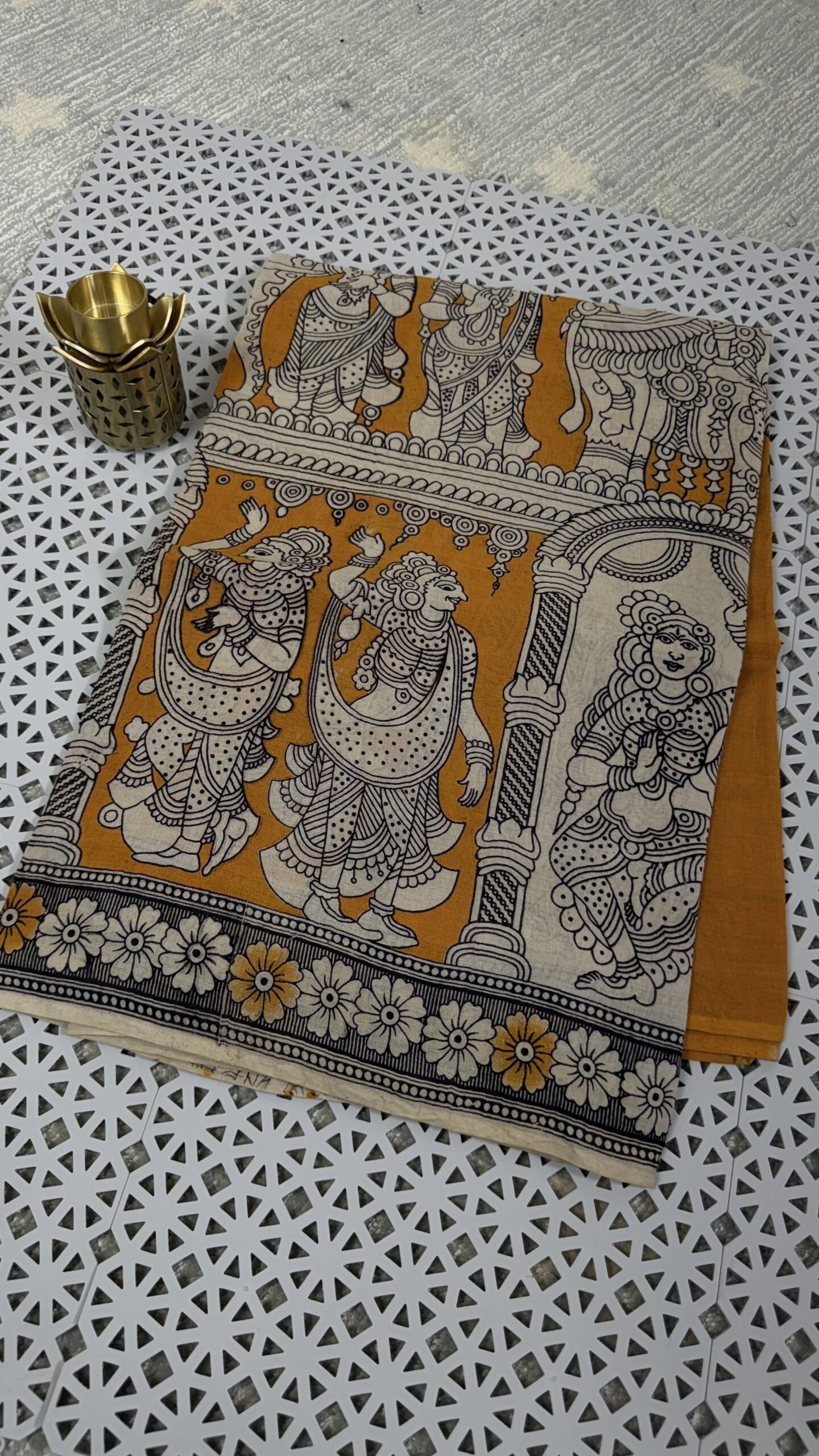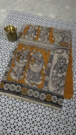 Kalamkari Cotton Saree Hyderabad – This pure handloom Kalamkari cotton saree is made using natural colors and traditional hand block Kalamkari printing techniques. The saree comes in a beautiful Mustard and Cream color combination, giving a rich ethnic and elegant look. This saree is lightweight, breathable, and very comfortable, making it perfect for daily wear, office wear, and traditional occasions.