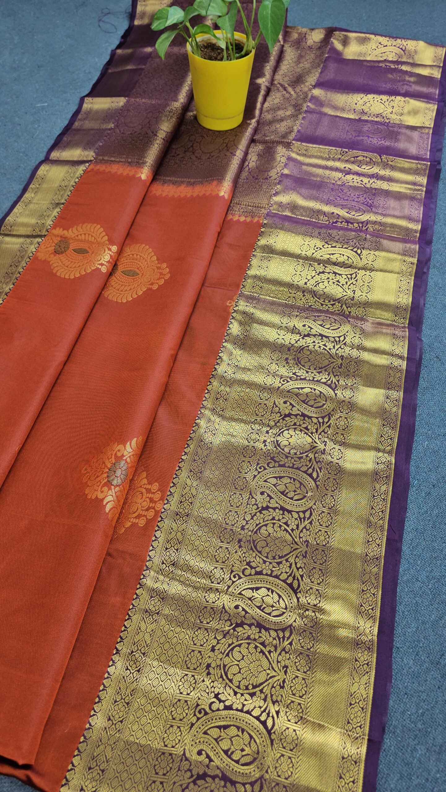 - Color: Vintage copper-maroon body with gold zari weaving