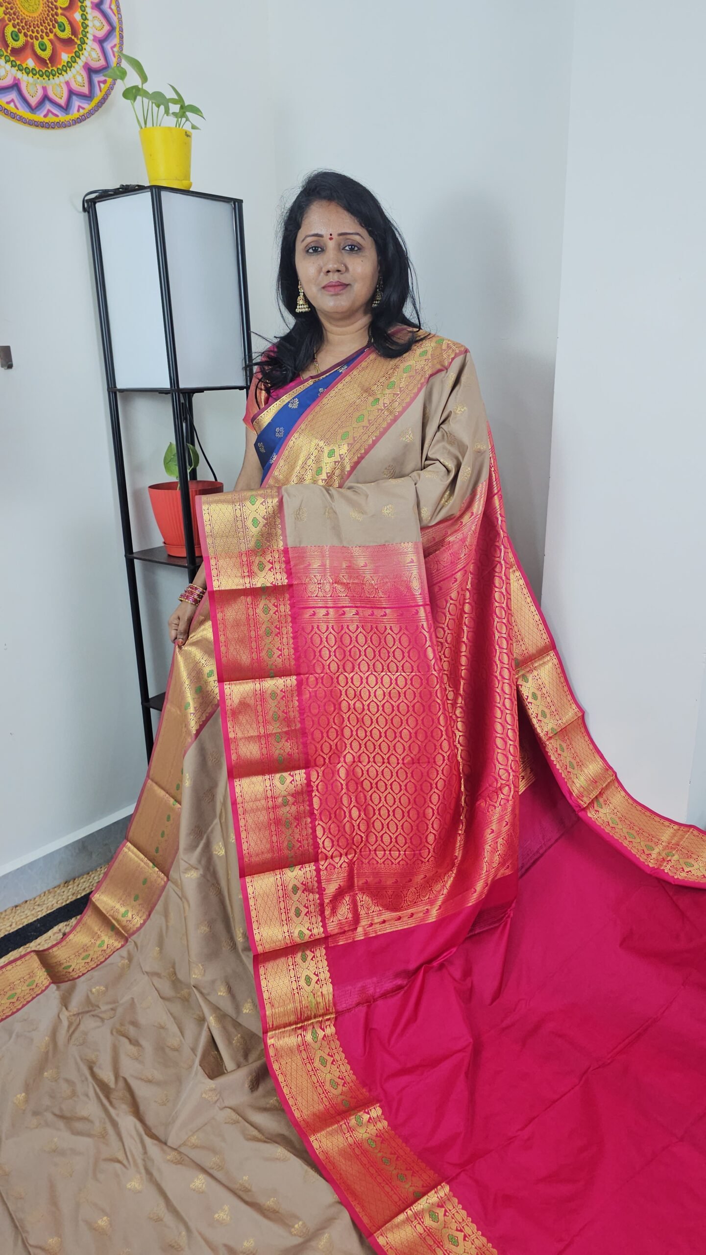 - Color: Beige body with Pink & Gold Meenakari Zari Border
