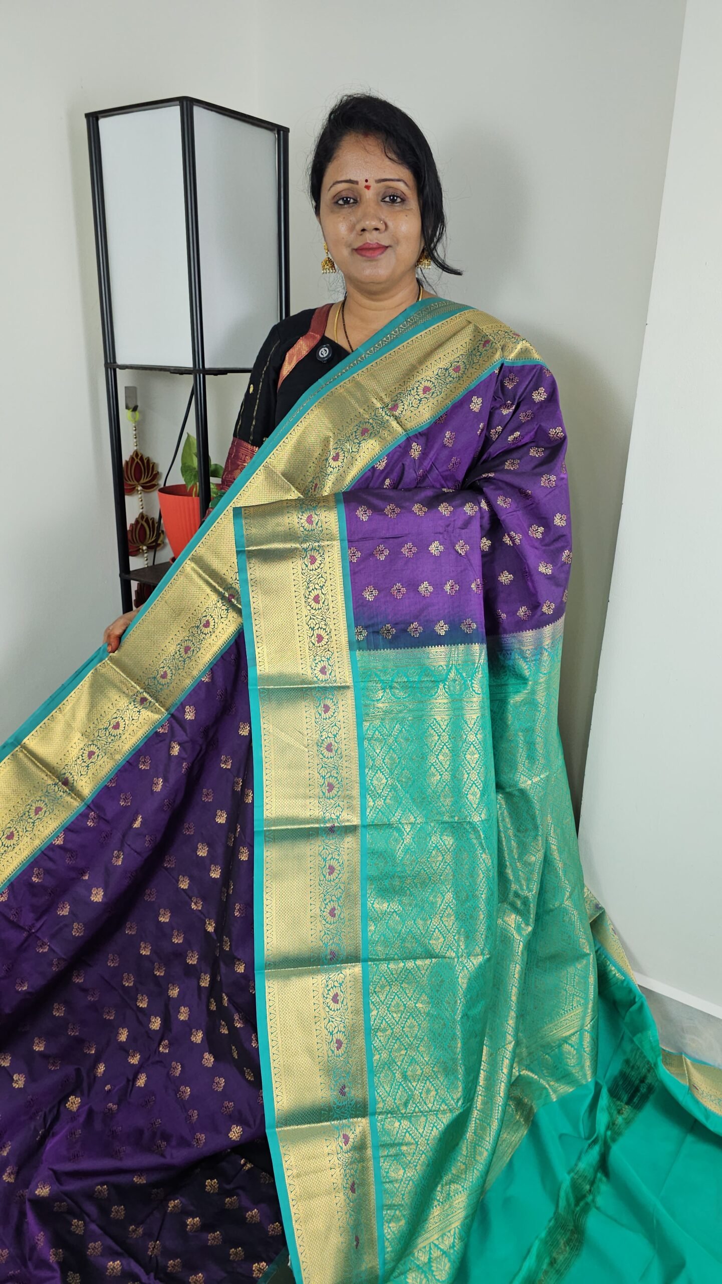 - Color: Rich Purple body with Sea Green & Gold Zari Border