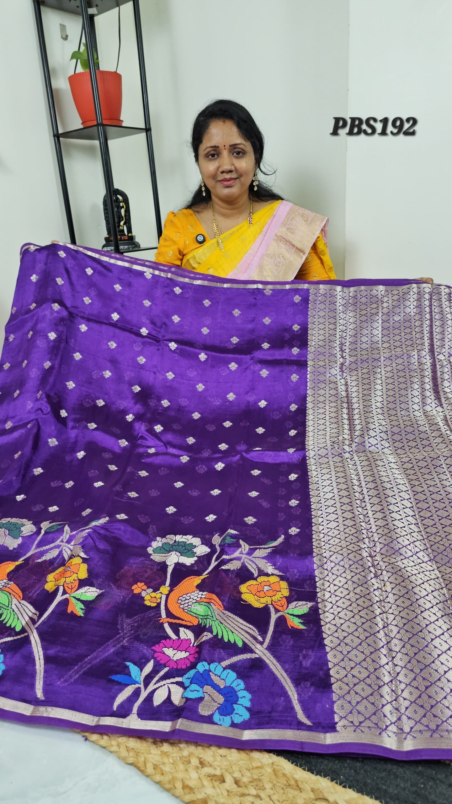 Experience effortless elegance with this Lightweight Paper Silk Pattu Saree (Code: PBS192). Crafted from super-soft paper silk, this saree features delicate allover butties and a striking Jamdani woven pallu with colorful floral and bird motifs. The feather-light drape makes it ideal for long festive days while retaining the opulent look of a traditional pattu saree.
