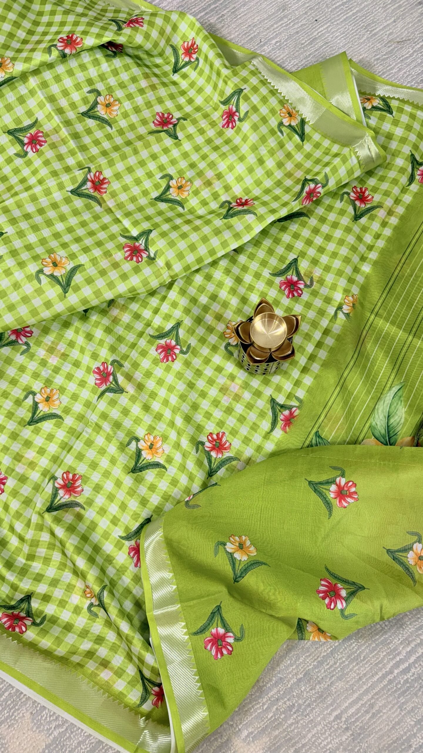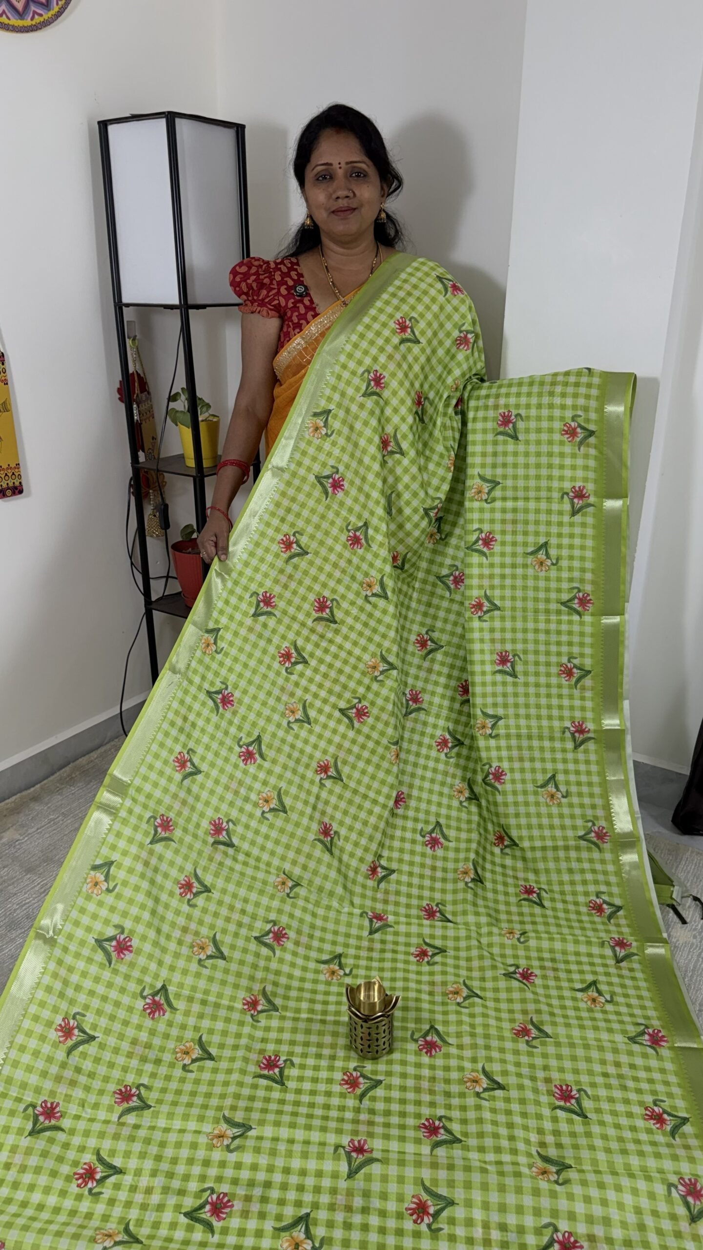 Light green semi Mangalagiri silk saree with elegant checks and floral prints. Lightweight, stylish, and perfect for daily wear and festive occasions.