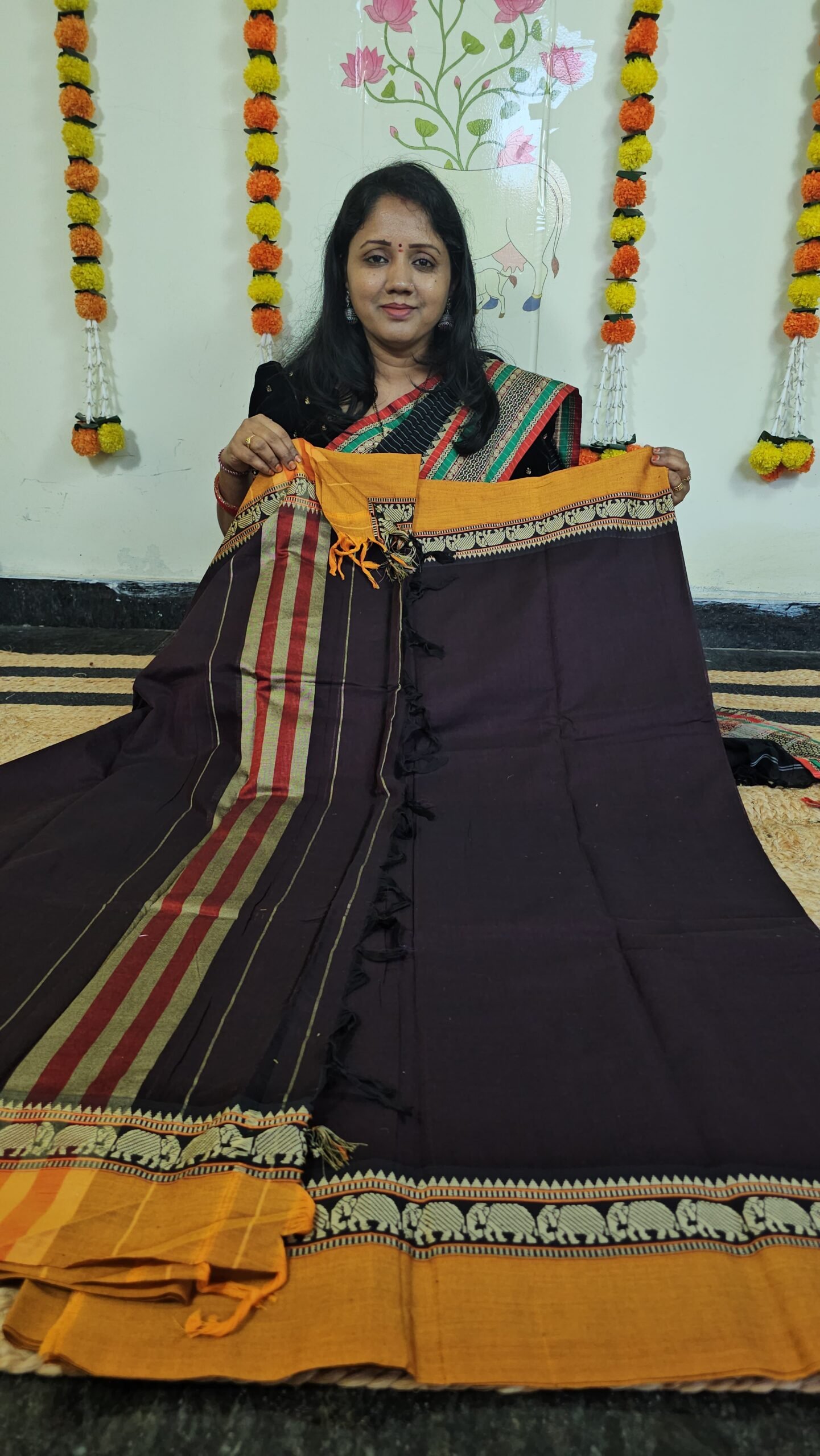 • Pattern: Handloom weaving stripes + elephant border