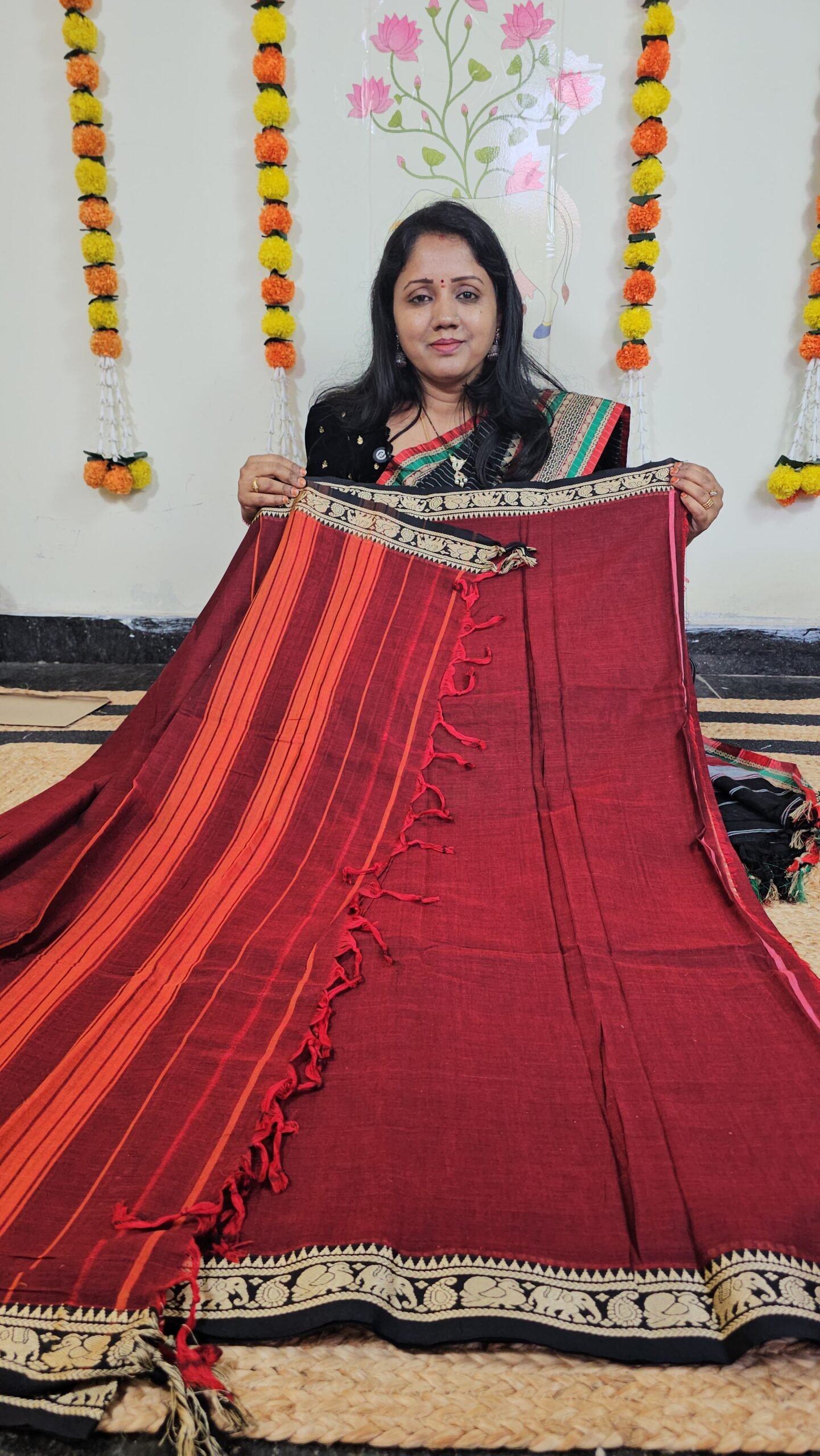 - Color: Maroon with Orange Stripes & Gold Zari Border
