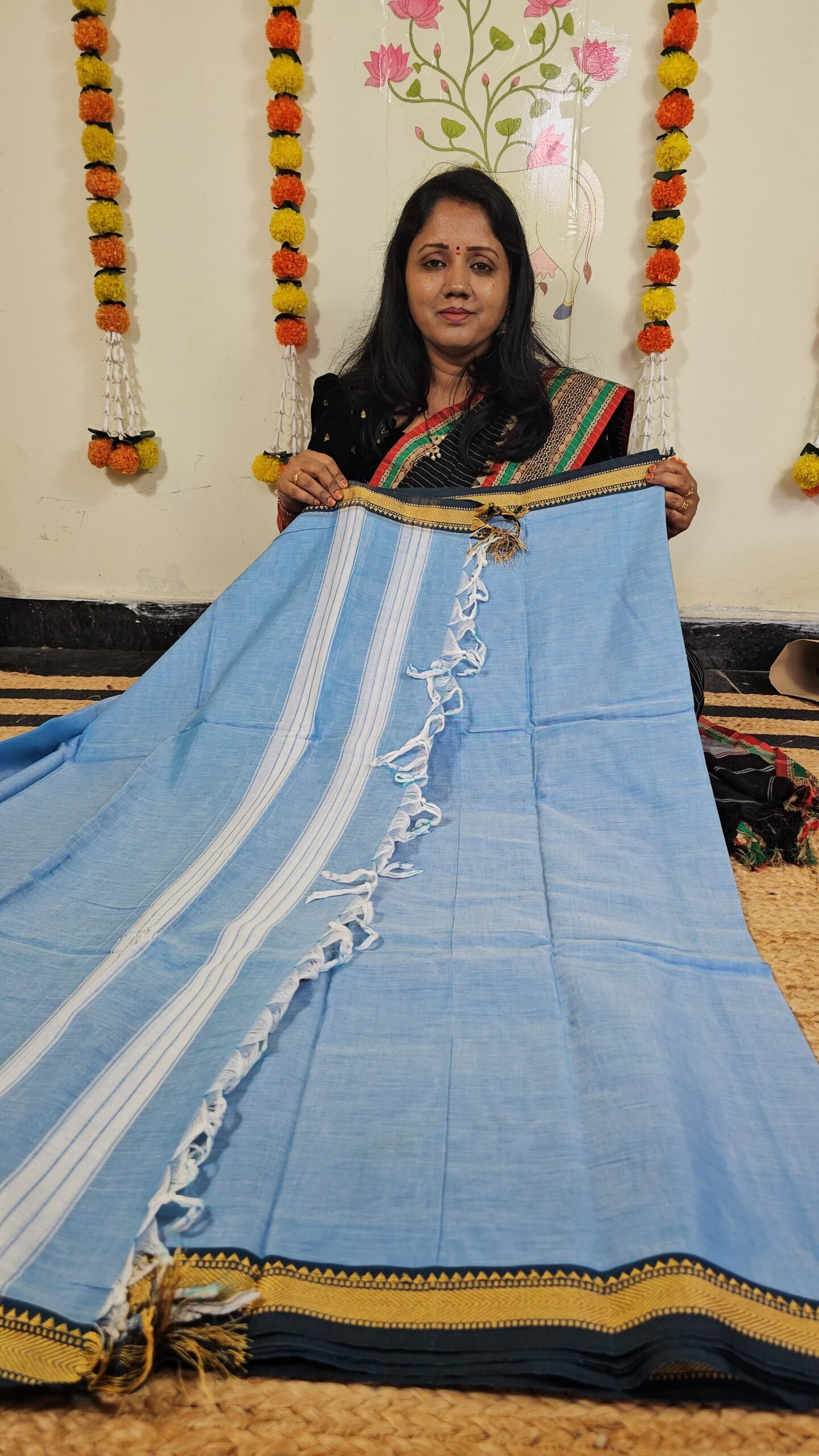 • 🌸 Colour: Sky Blue with contrast golden zari border