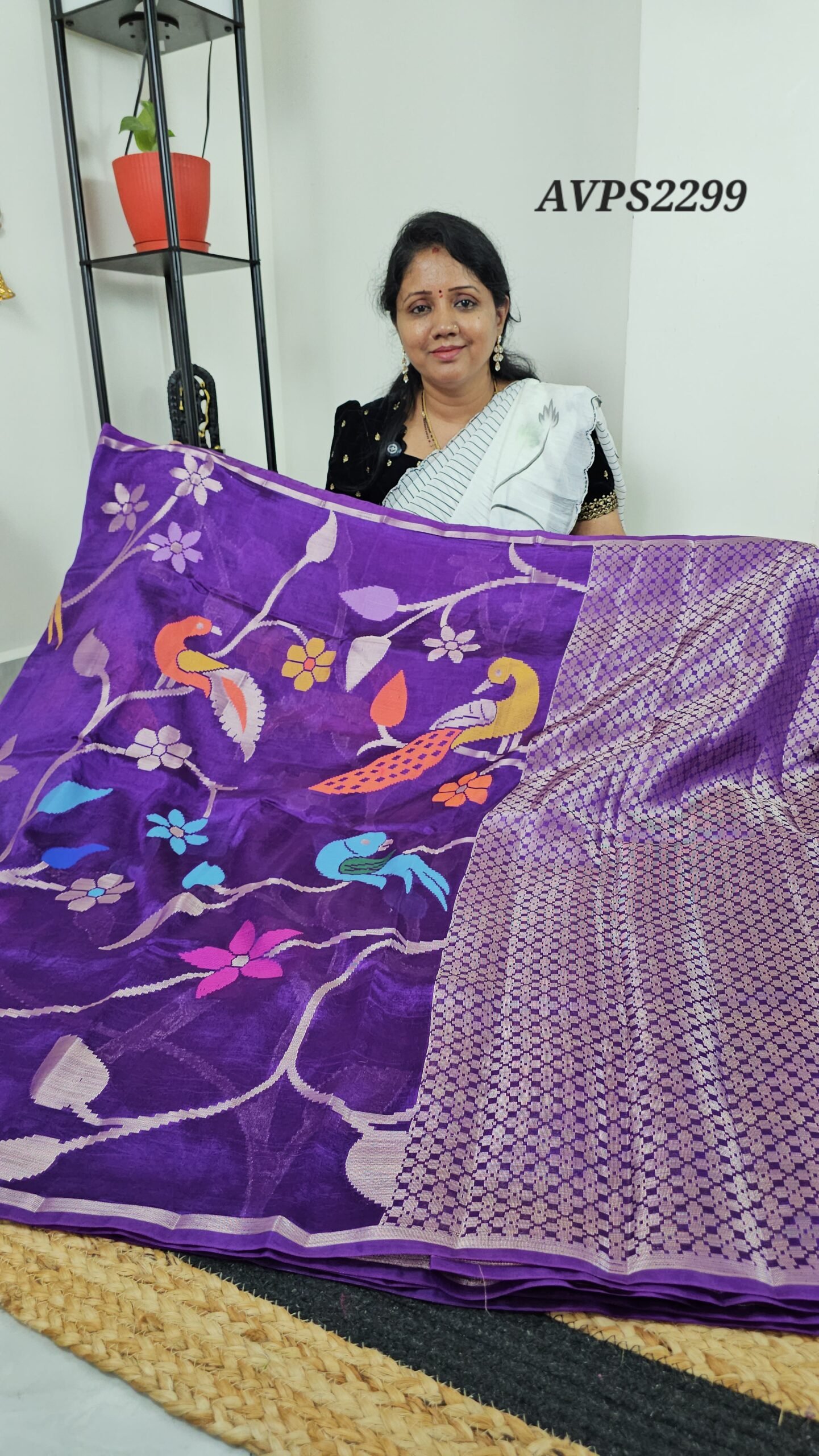 - Allover Jamdani weaving with colorful bird and floral motifs