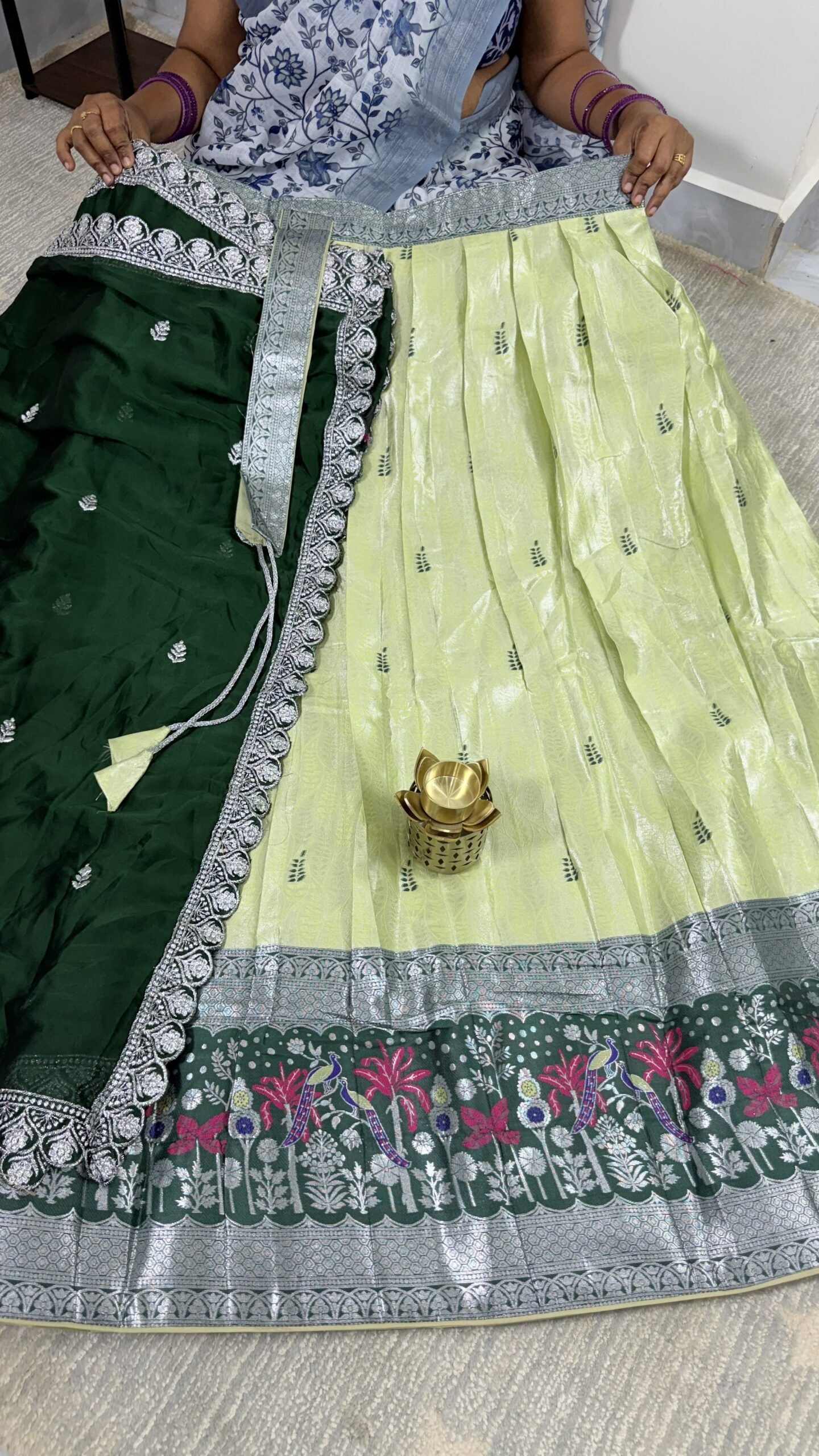 Pastel Half Saree Set – Lime Yellow & Bottle Green Kanchi Tissue Lehenga | PKTH2503