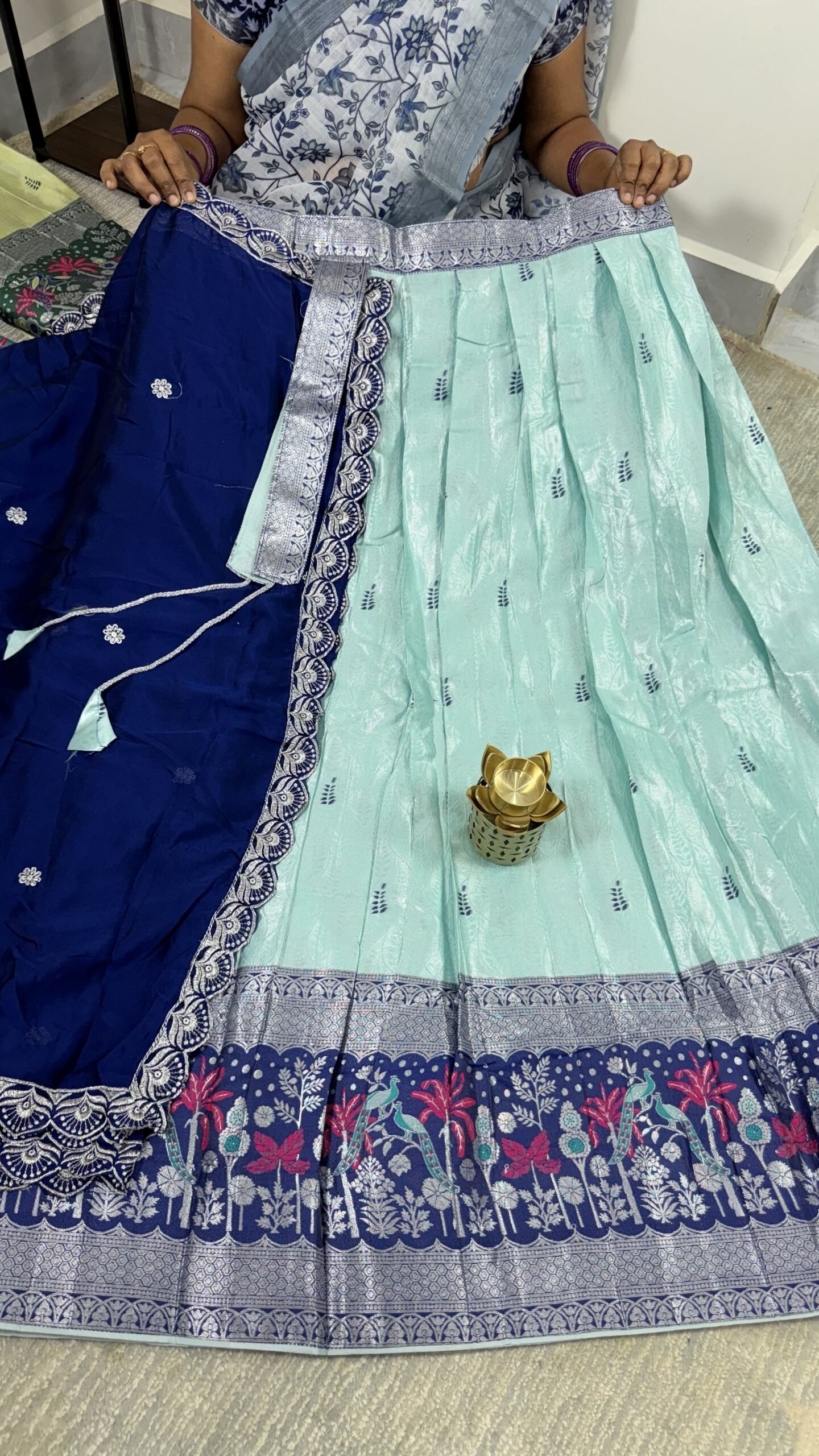 Mint green & navy blue pastel half saree set in Kanchi tissue with Meena weaving and peacock border. Perfect for weddings & festive wear.