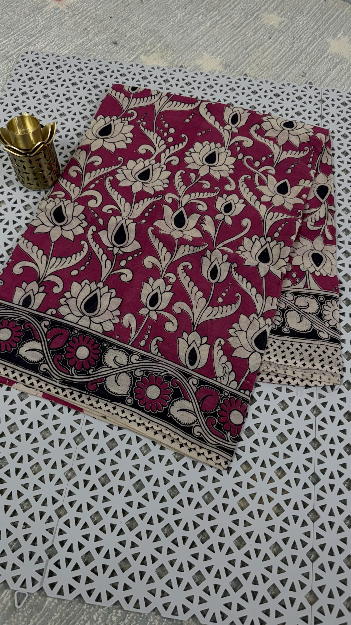 Pure Handloom Kalamkari Cotton Saree featuring elegant floral butta Kalamkari hand block prints with a traditional Kalamkari printed border. Made using natural dyes and handloom cotton fabric, this saree is lightweight, breathable, and perfect for daily wear, office wear, and casual traditional wear.