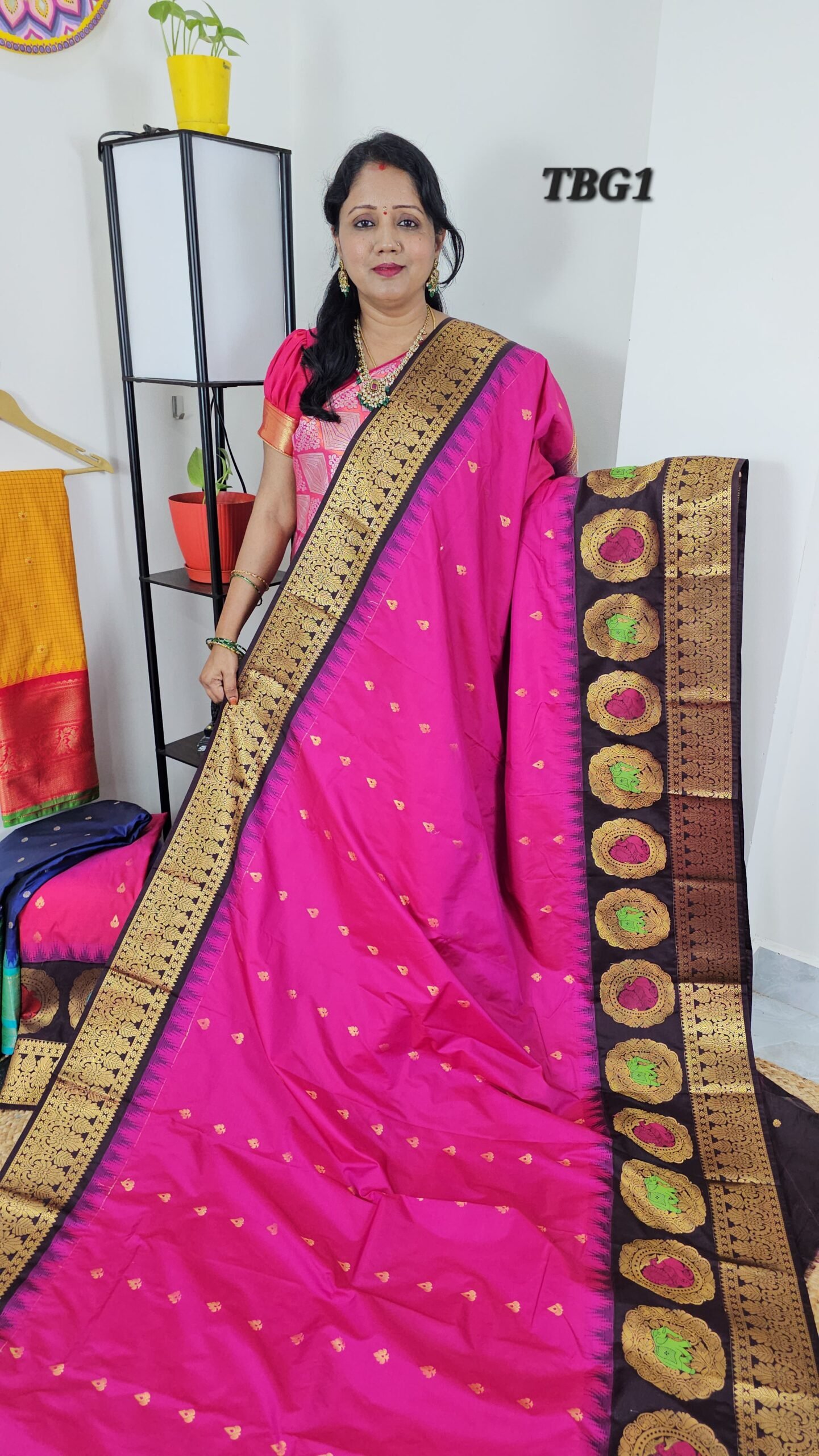 Step into the world of timeless elegance with our Premium Gadwal Silk Turning Border Saree (TBG1). This masterpiece is designed for women who love to celebrate tradition while embracing luxurious craftsmanship. The saree features a striking pink body with brown contrast border, embellished with intricate zari weaving and stunning Meena detailing. With its turning border, rich pallu, and allover butties, this saree embodies the perfect blend of culture and style.