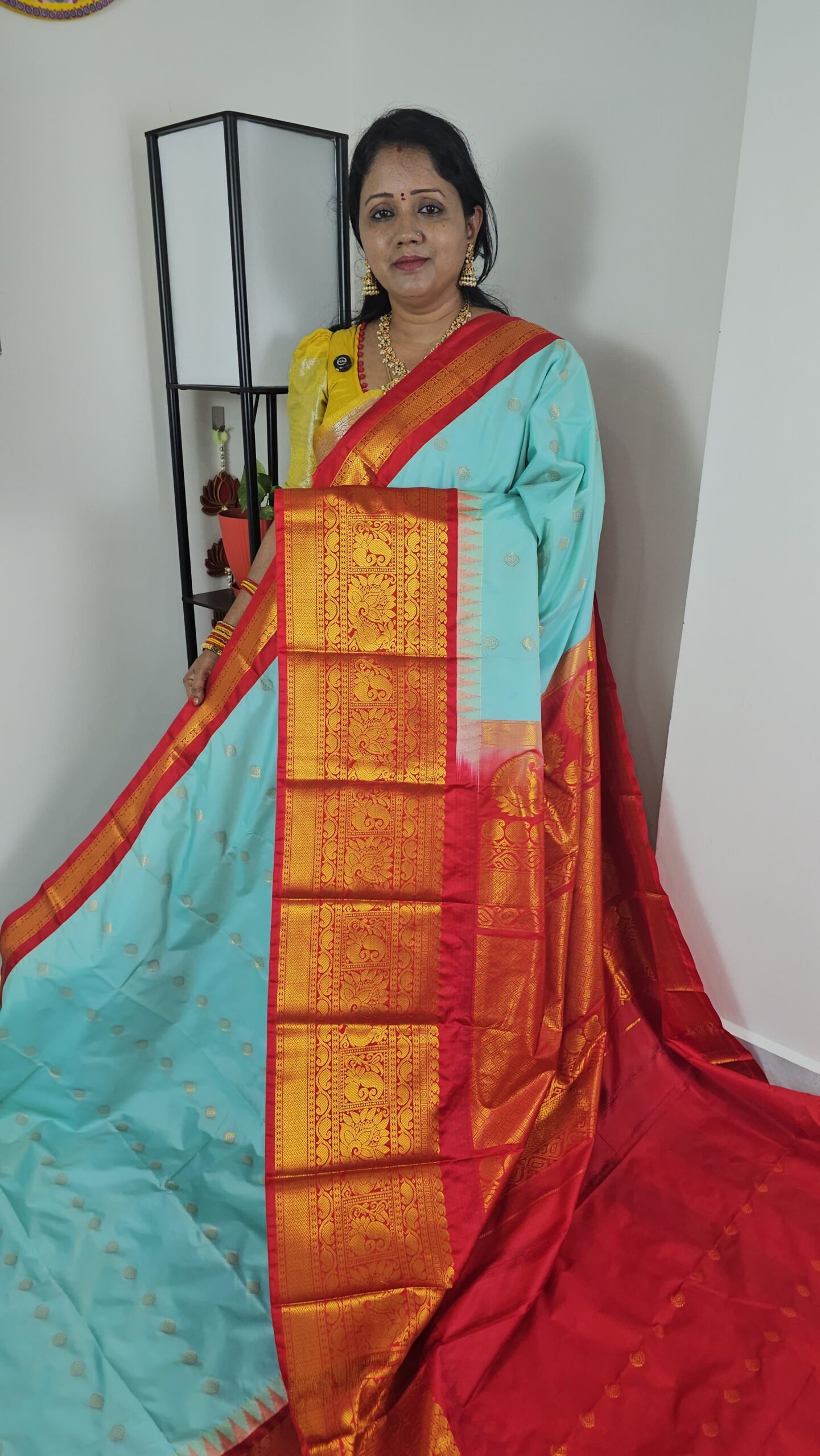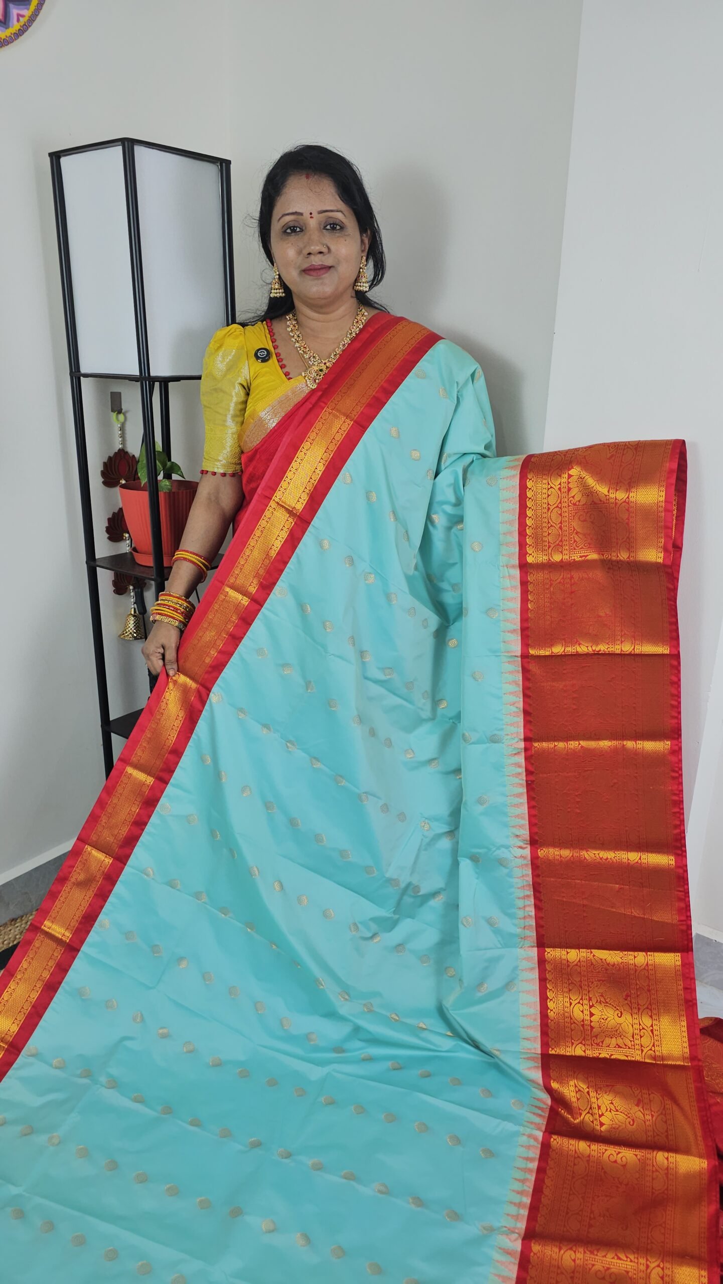 Grace meets tradition in this Sky Blue Semi Gadwal Saree featuring a grand red zari border – exclusively from Sasu Fashions Hyderabad.