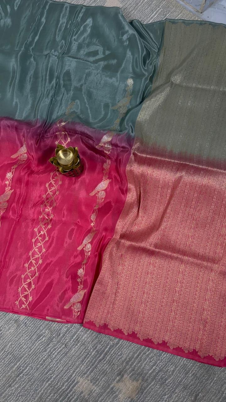 Pure Ho Crepe Saree from our High Fancy Designer Collection, designed with a modern half & half color concept and elegant zari weaving bird design stripes. The borderless concept gives a sleek designer finish, while the rich pallu adds a grand festive look. Perfect for parties, receptions, and special occasions in Hyderabad.