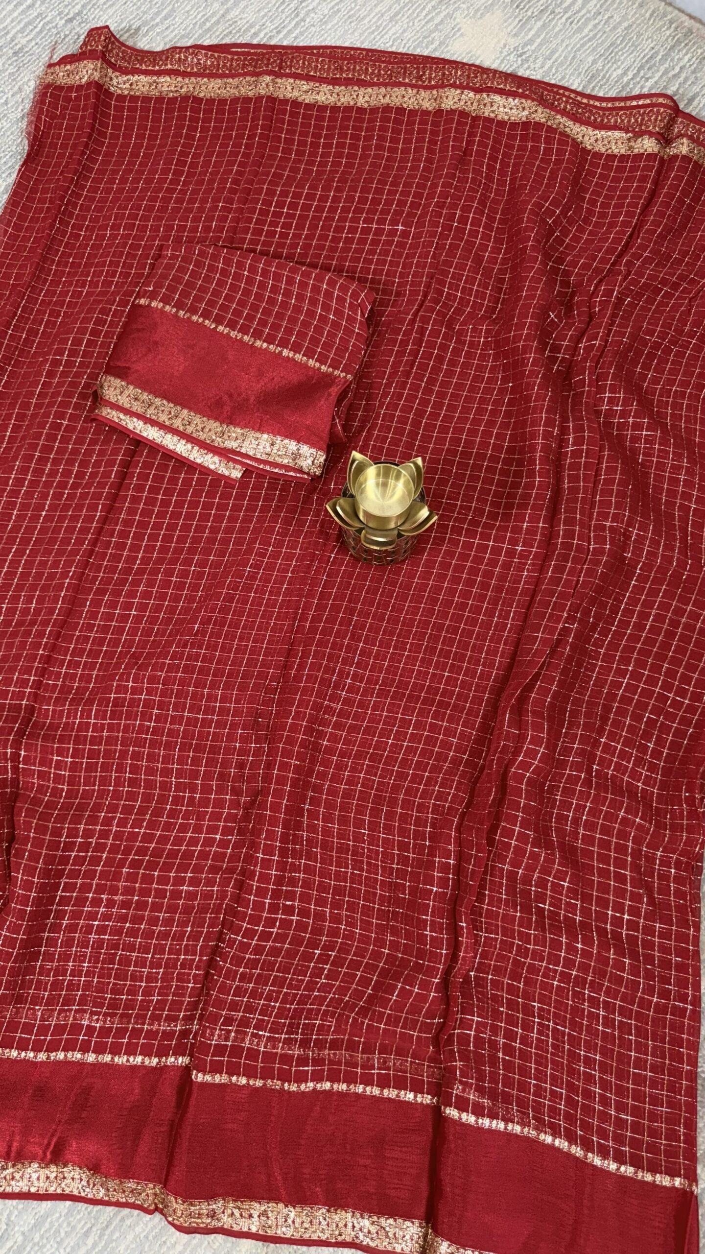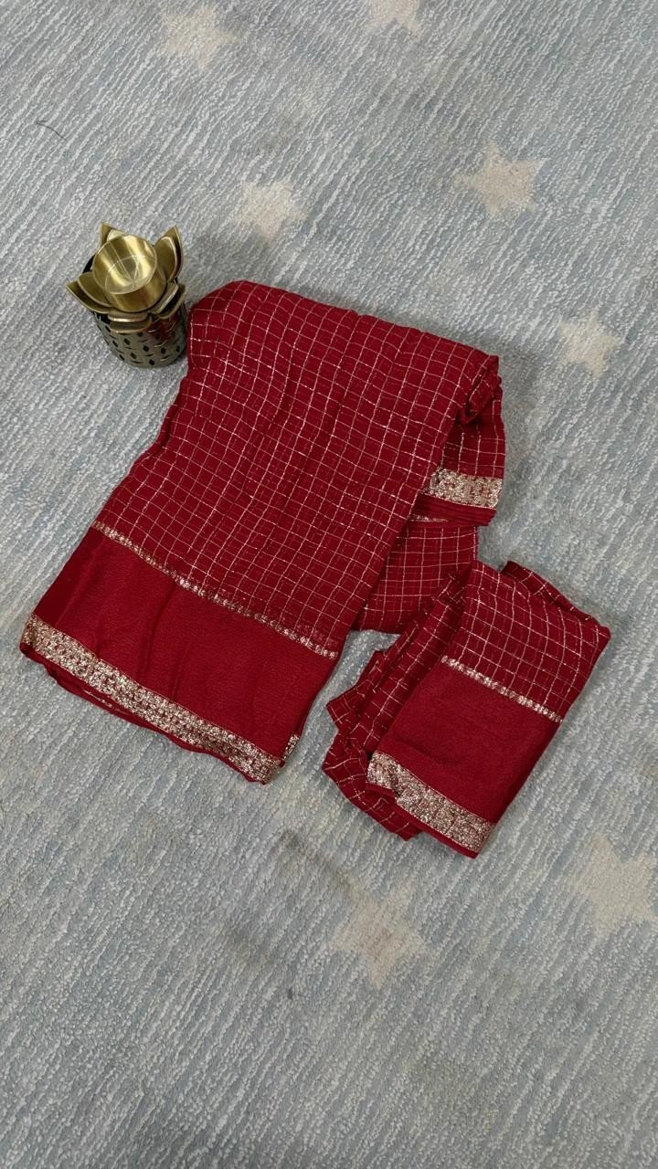 Red viscose georgette saree with checks pattern and satin zari border. Lightweight and perfect for daily wear.
