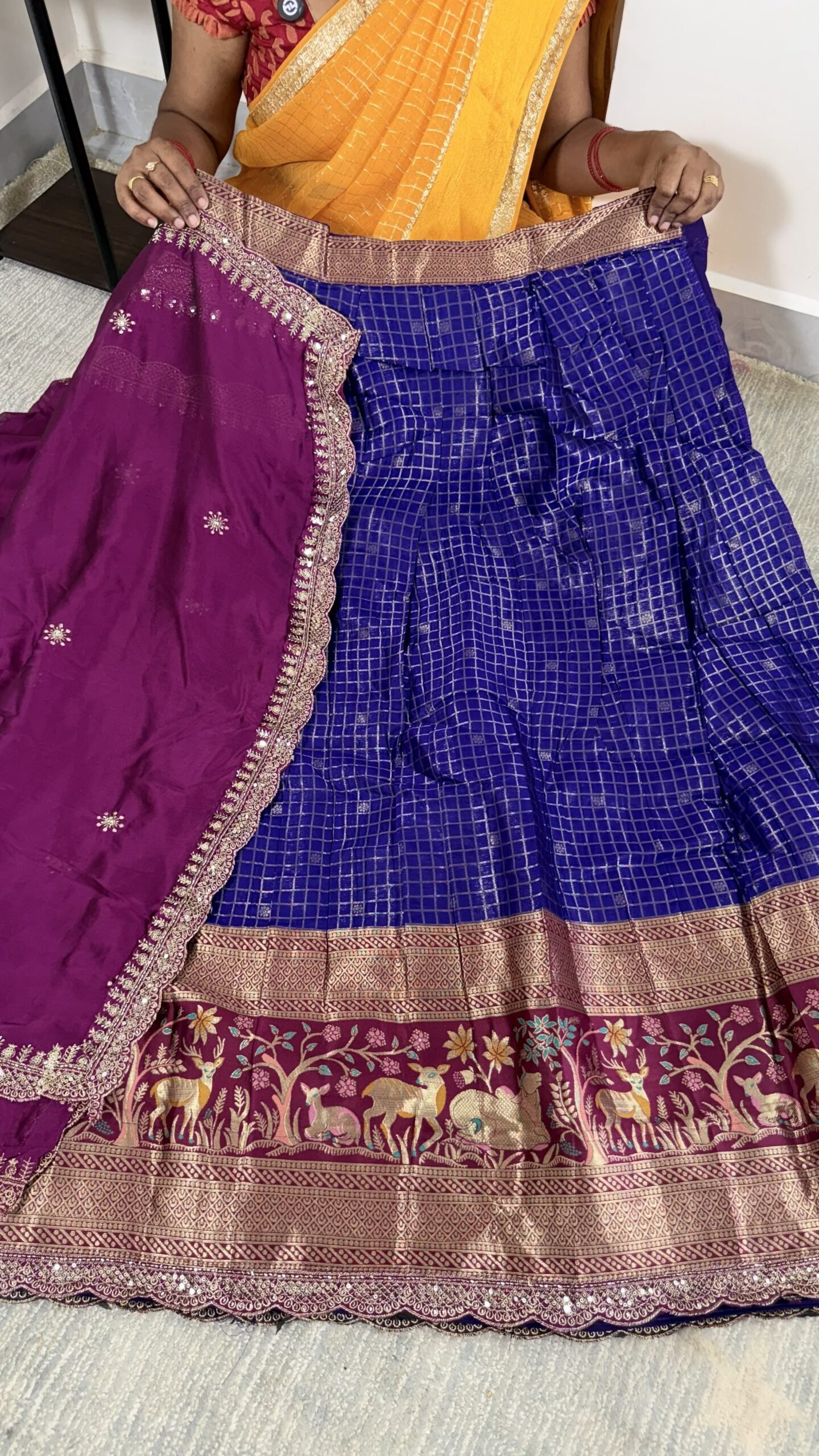 Enhance your ethnic wardrobe with this royal blue vintage checks lehenga set paired with a rich magenta dupatta. Designed with intricate Kanchi Meena weaving borders featuring traditional animal and floral motifs, this set offers a regal and festive look.