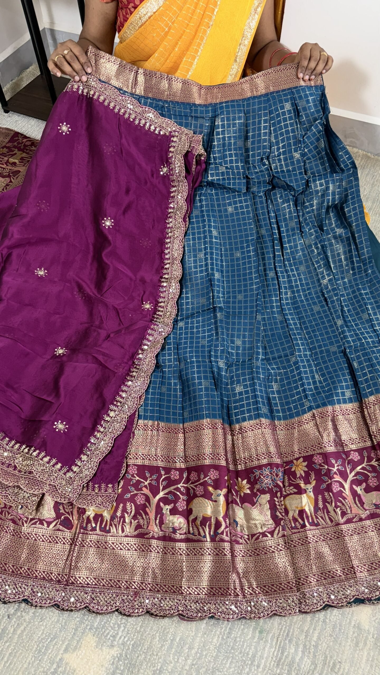 Teal blue vintage checks lehenga set with rich Kanchi Meena border and magenta dupatta. Ideal for festive and wedding wear.