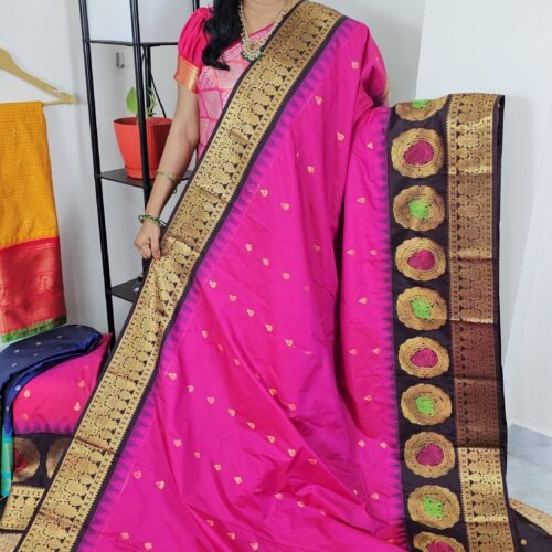Known for their lightweight texture, contrasting borders, and zari artistry, Gadwal sarees are a timeless representation of South Indian handloom heritage. This saree blends elegance and comfort for long wear during festivals and weddings.