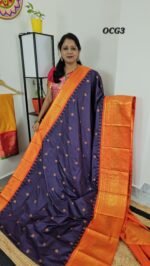 Gadwal sarees are treasured for their unique weaving tradition, contrasting borders, and lightweight comfort. This saree’s combination of navy blue and orange zari is striking and regal, making it perfect for weddings and festive occasions. The weaving details ensure both durability and elegance.