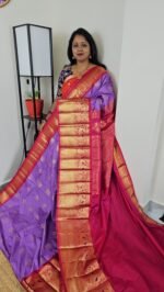 This saree combines vintage charm with lightweight comfort. The fine zari weaving throughout the body adds a touch of richness, while the border and pallu give it a luxurious finish.
