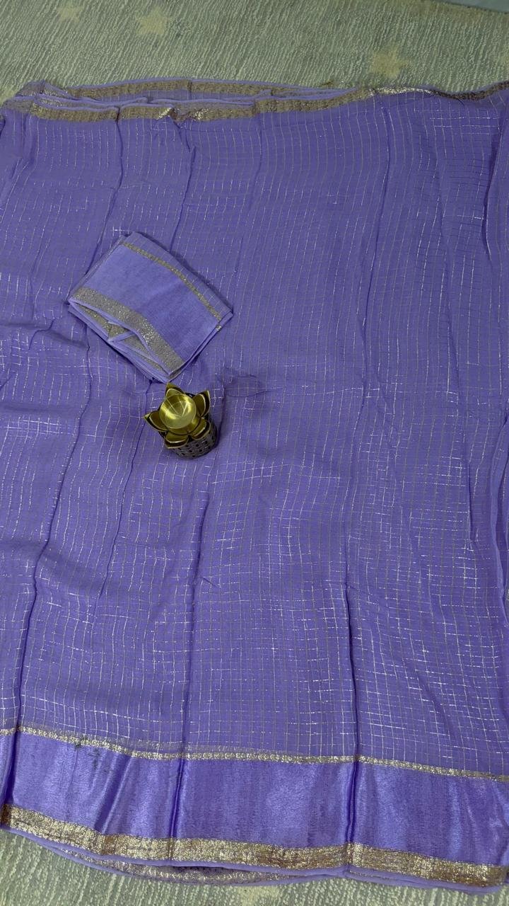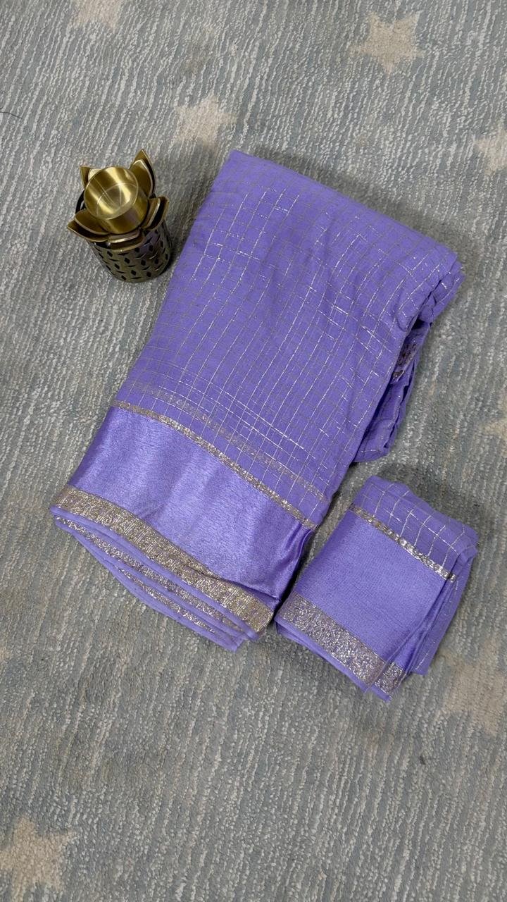 Lavender Viscose Georgette Saree with elegant checks pattern and zari border. Lightweight & perfect for daily wear.